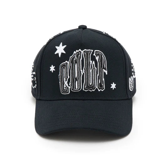 This Cult X El Alfa collab 5 Panel A-Frame hat features a detailed "Cult" embroidery on the front, accented with a paisley pattern all over the hat crafted from white and black stones. This is the perfect hat to pair with our "Paisley" tee from our Cult X El Alfa collection.